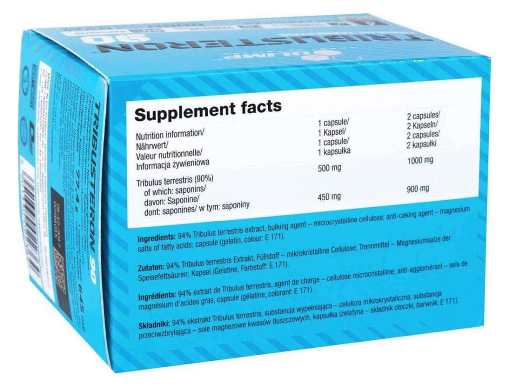 Nem hormonkészítmény, de bizonyos összetevői (szaponin) okozhatnak jelentős növekedést a tesztoszteron szintben a férfiaknál és az ösztrogén szintben a hölgyeknél, de még egészséges mértéken belül. Az Olimp Tribusteron 90 stimuláló és erőt adó hatású – növeli a test vitalitását és erejét, aktiválja az anabolikus folyamatokat és fokozza a teljesítőképességet.
