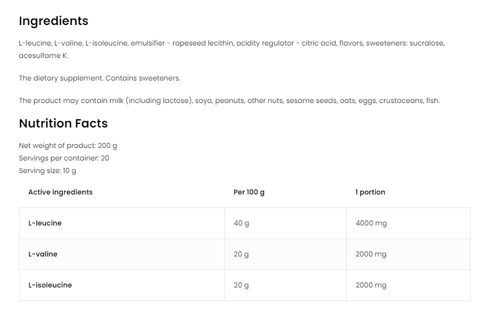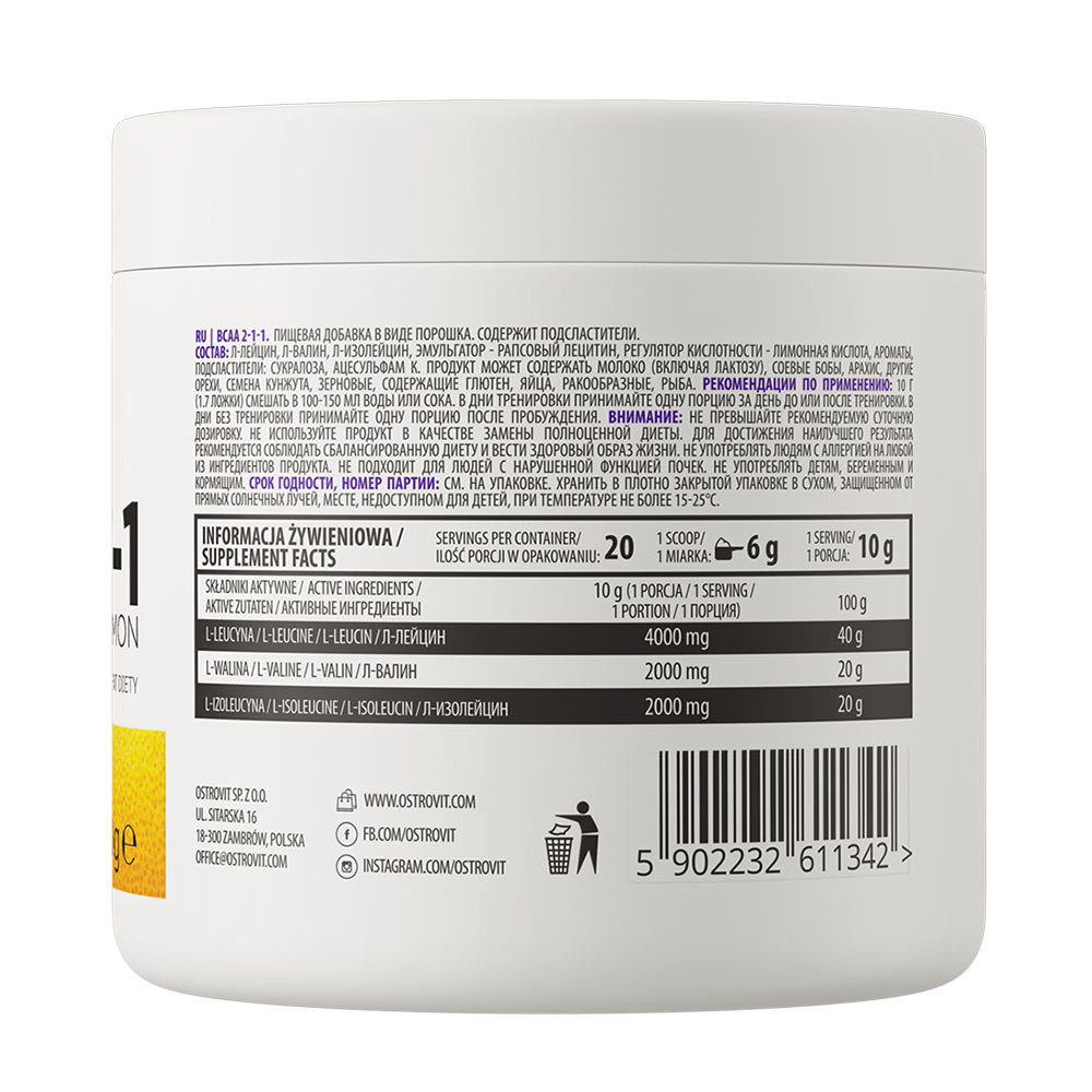 Az OstroVit BCAA 2-1-1 egy étrend-kiegészítő, amely a legjobb minőségű elágazó láncú aminosavakat, a BCAA-t tartalmazza, a legjobb 2:1:1 arányban. Ezek az aminosavak a következők: leucin, izoleucin, valin. Ezeket azért kell a szervezetbe juttatni, mert az úgynevezett exogén aminosavak közé tartoznak - olyan aminosavak, amelyeket az emberi szervezet nem képes saját maga előállítani.