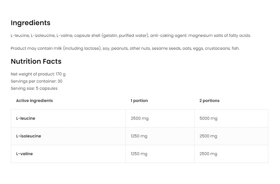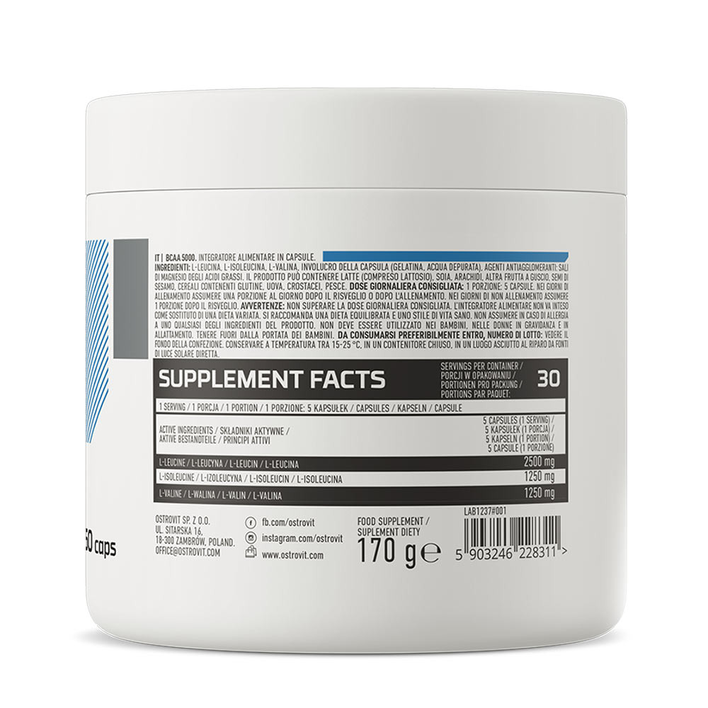Az OstroVit BCAA 5000 egy étrend-kiegészítő, amely a legjobb minőségű elágazó láncú aminosavakat BCAA-t tartalmazza, a legjobb 2:1:1 arányban. Ezek az aminosavak a következők: leucin, izoleucin, valin. Ezeket azért kell a szervezetbe juttatni, mert az úgynevezett exogén aminosavak közé tartoznak - olyan aminosavak, amelyeket az emberi szervezet nem képes saját maga előállítani.