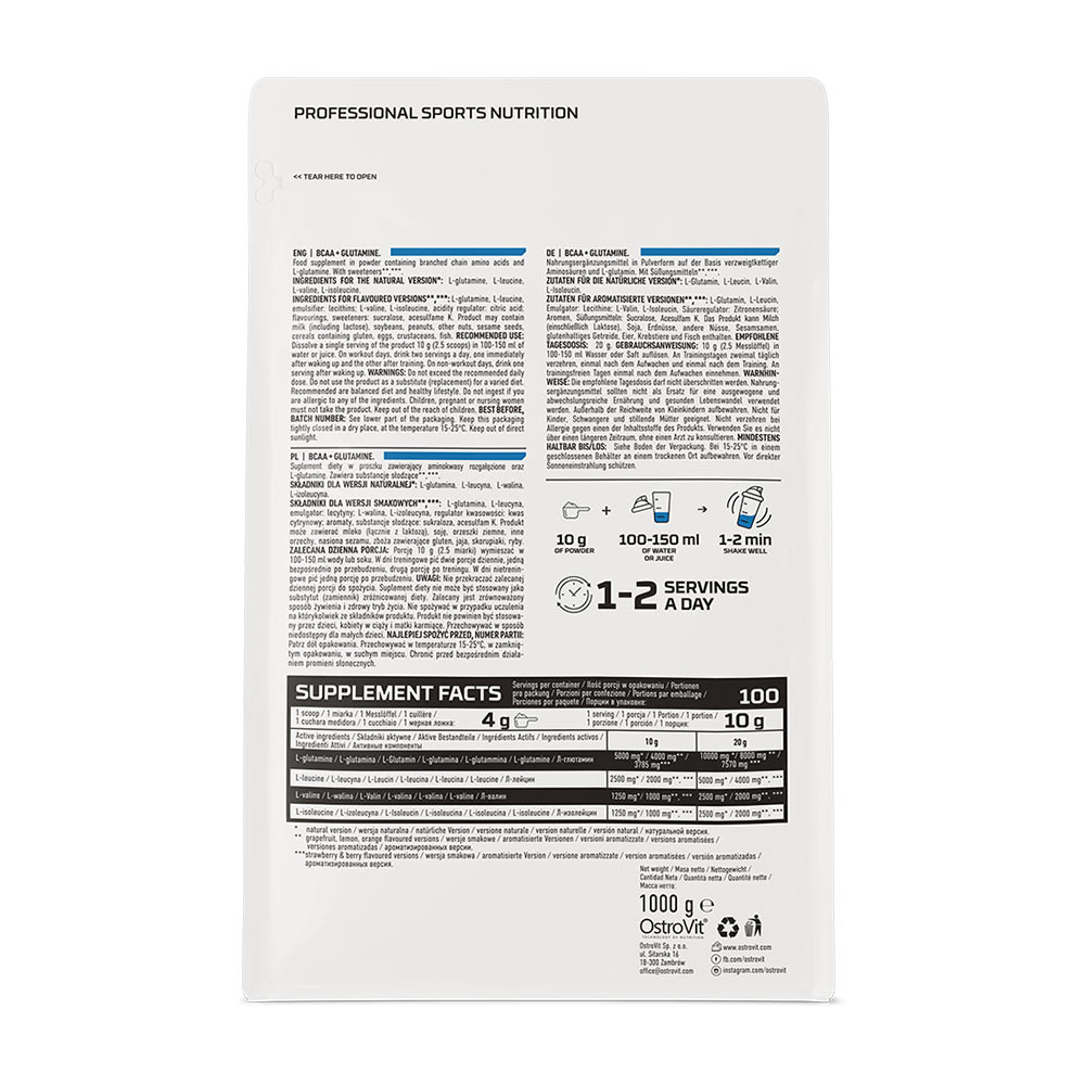 Az OstroVit BCAA + Glutamine egy kiváló minőségű étrend-kiegészítő, amely L-glutamin és elágazó láncú aminosavak - L-leucin, L-izoleucin és L-valin - forrása. Egyszerű összetételű és természetes ízű készítmény, amely kényelmes por formában kapható. Olyan sportolók és fizikailag aktív emberek számára készült termék, akik napi étrendjüket értékes aminosavakkal szeretnék kiegészíteni.