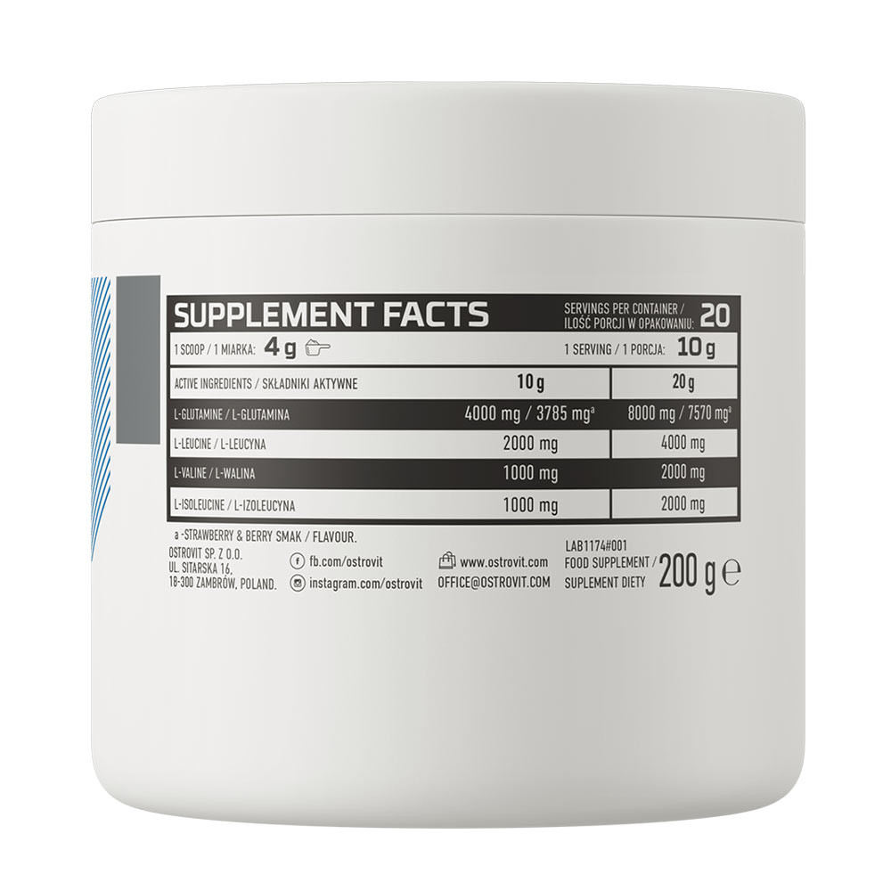 Az OstroVit BCAA + Glutamine egy kiváló minőségű étrend-kiegészítő, amely L-glutamin és elágazó láncú aminosavak - L-leucin, L-izoleucin és L-valin - forrása. Egyszerű összetételű és természetes ízű készítmény, amely kényelmes por formában kapható. Olyan sportolók és fizikailag aktív emberek számára készült termék, akik napi étrendjüket értékes aminosavakkal szeretnék kiegészíteni.