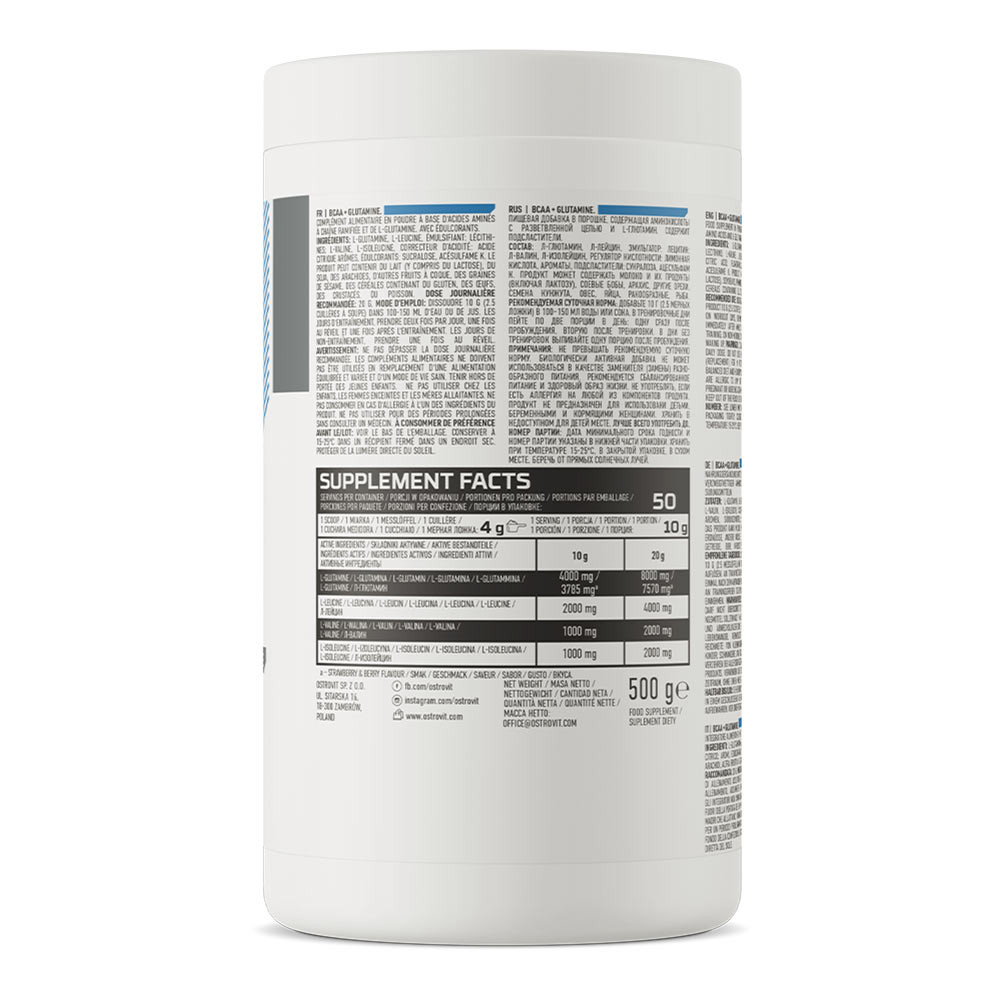 Az OstroVit BCAA + Glutamine egy kiváló minőségű étrend-kiegészítő, amely L-glutamin és elágazó láncú aminosavak - L-leucin, L-izoleucin és L-valin - forrása. Egyszerű összetételű és természetes ízű készítmény, amely kényelmes por formában kapható. Olyan sportolók és fizikailag aktív emberek számára készült termék, akik napi étrendjüket értékes aminosavakkal szeretnék kiegészíteni.