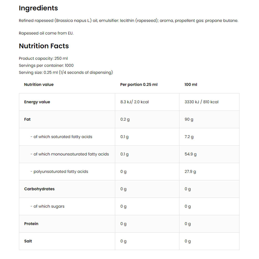 Használat előtt enyhén rázd fel a flakont. Használat előtt fújj egy réteg olajat kb. 20 cm távolságban közvetlenül a serpenyőre, grillre, sütőlapra, mielőtt beleteszed az ételt és felmelegíted az eszközt.