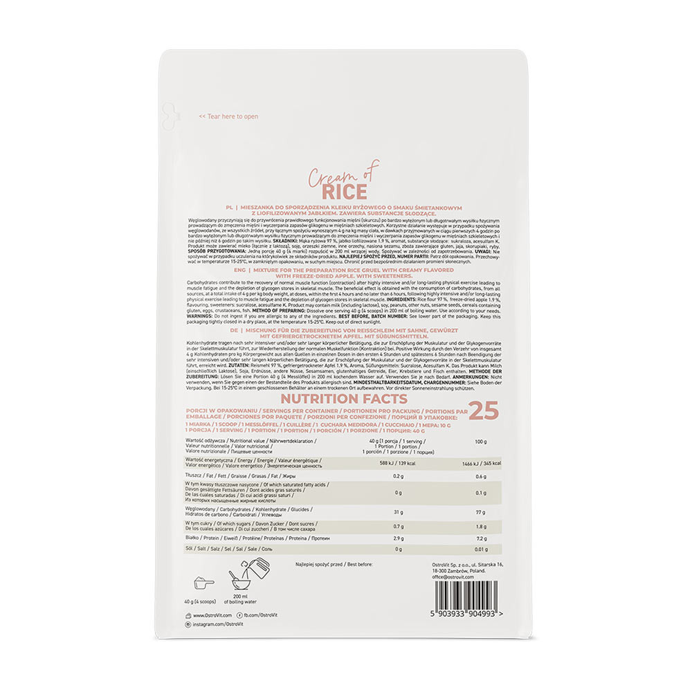 • MAGAS SZÉNHIDRÁT-TARTALOM - Mivel egy adag termék 31 g szénhidrátot tartalmaz, az OstroVit Cream of Rice pép tökéletes választás lesz minden fizikailag aktív ember számára. A termék edzés utáni használata elősegíti a glikogén tartalékok helyreállítását.