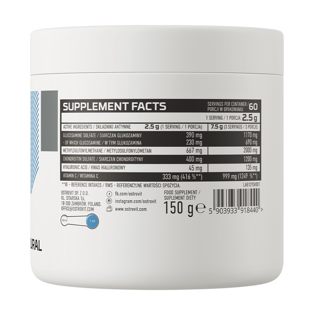 Az OstroVit Glucosamine + MSM + Chondroitin egy kiváló minőségű étrend-kiegészítő, amely glükozamin, kondroitin, MSM, valamint hialuronsav és C-vitamin forrása. Természetes ízű, por alakban kapható készítmény. Sportolók és olyan emberek számára létrehozott termék, akiket az értékes vegyületek iránti fokozott igény jellemez.