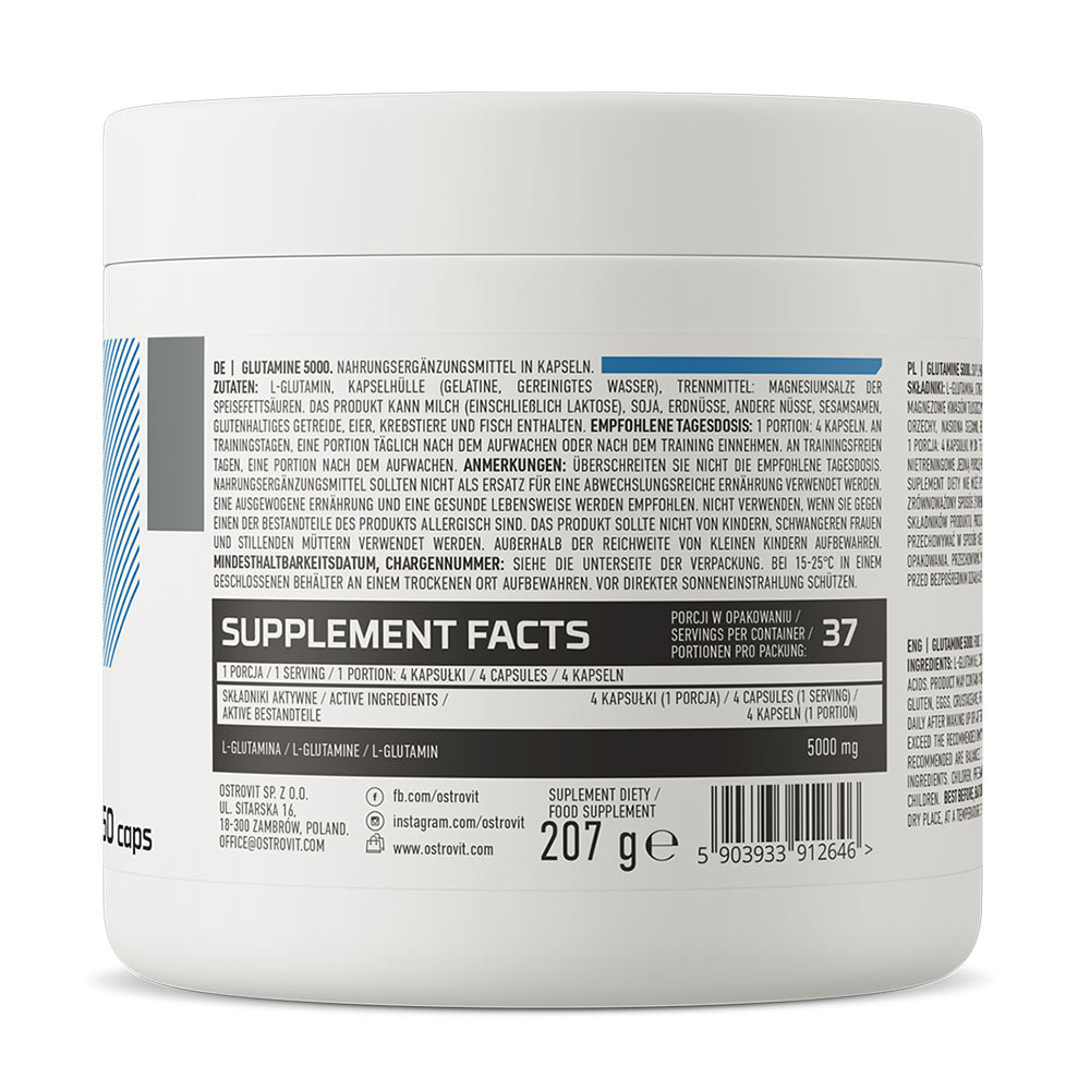 Az OstroVit Glutamine 5000 mg egy kiváló minőségű étrend-kiegészítő, amely az L-glutamin nevű aminosav forrását biztosítja. Könnyen lenyelhető kapszula formájában kapható készítmény, amelyet sportolók és olyan emberek számára terveztek, akik szeretnék étrendjüket kiegészíteni egy értékes vegyülettel.