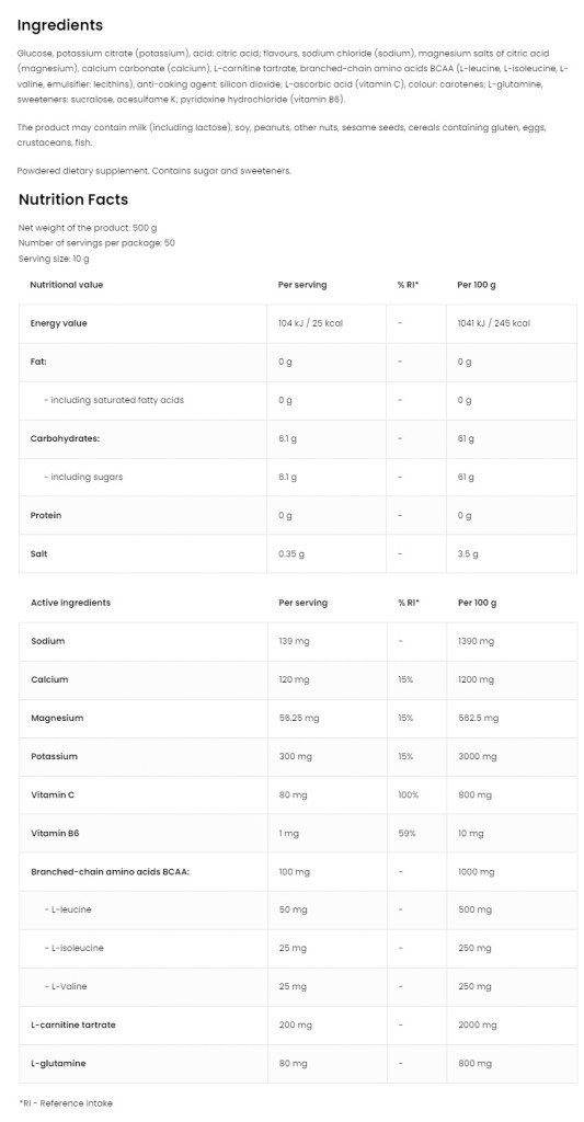 • Gazdag elektrolitokban és értékes tápanyagokban - Az étrend-kiegészítő egy adagja 139 mg nátriumot, 120 mg kalciumot, 56,25 mg magnéziumot, 300 mg káliumot, valamint 80 mg C-vitamint és 1 mg B6-vitamint biztosít a szervezet számára. Ezenkívül a termék 100 mg BCAA-t, 200 mg L-karnitin-tartarátot és 80 mg L-glutamint tartalmaz.