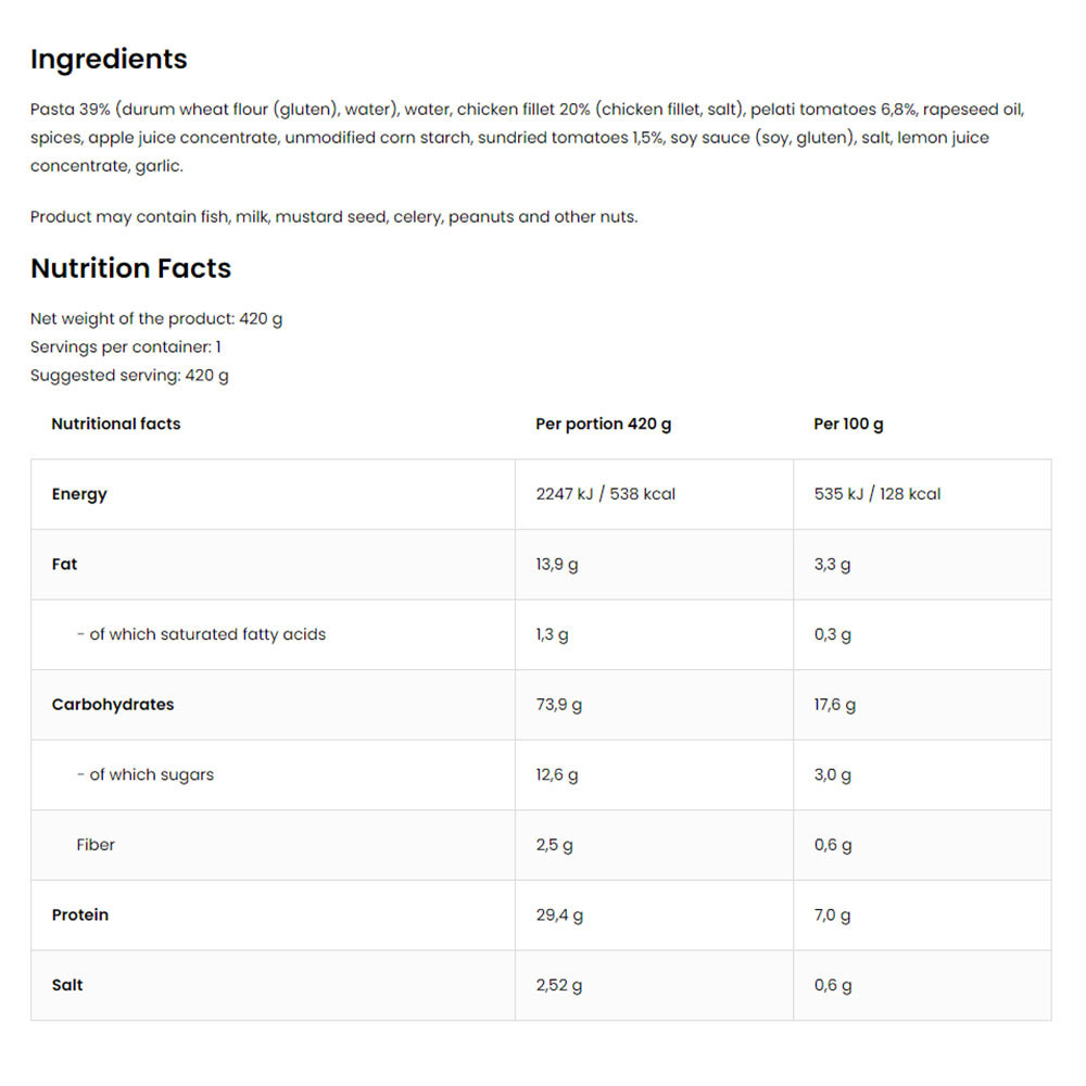Az instant étel csirkével toszkán mártással és tésztával azok számára, akik szeretik az olasz tésztákat. A durumbúzalisztnek köszönhetően a tészta mindig kellően kemény, és ásványi anyagokban és B-csoportú vitaminokban gazdag a hagyományos búzából készült tésztákhoz képest. Ráadásul a glikémiás indexe is alacsonyabb. A csirkemell nagy mennyiségű fehérjét, vitaminokat és olyan ásványi anyagokat biztosít, mint a cink, a szelén és a magnézium.