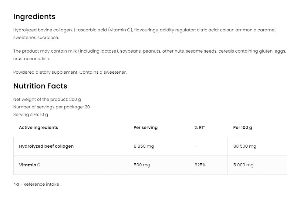 Kiváló minőségű étrend-kiegészítő, amely hidrolizált marhahús kollagén és értékes L-aszkorbinsav forrása.