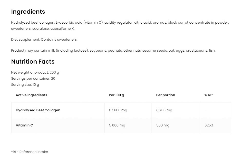 • A hidrolizált marhahús kollagén forrása - Egy adag étrend-kiegészítő akár 8 766 mg értékes vegyületet is biztosít a szervezet számára.