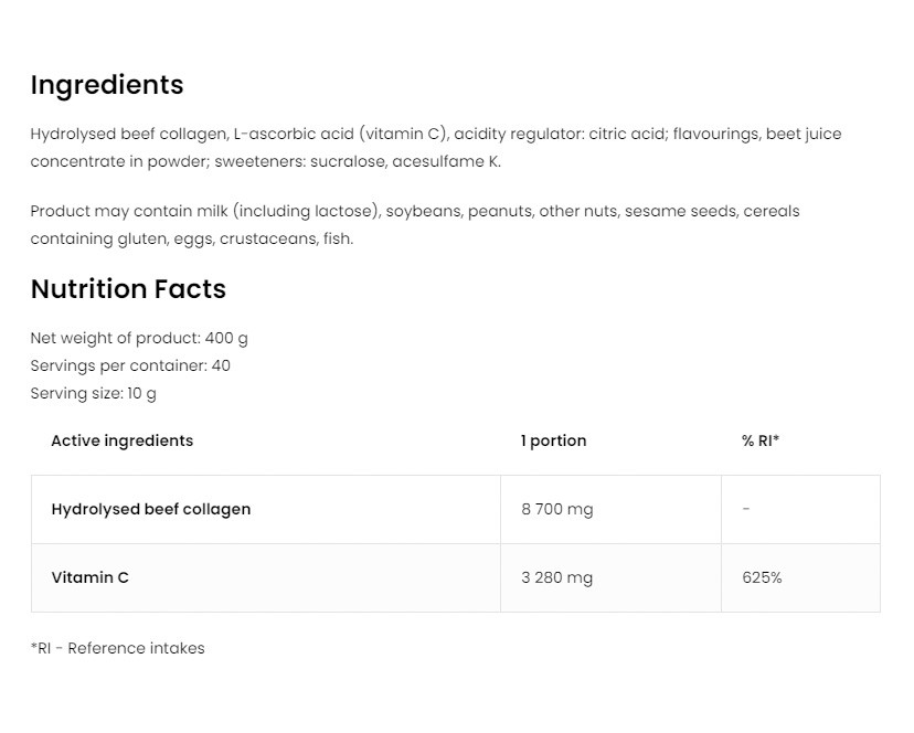 • A hidrolizált marhahús kollagén forrása - Egy adag étrend-kiegészítő akár 8 766 mg értékes vegyületet is biztosít a szervezet számára.
