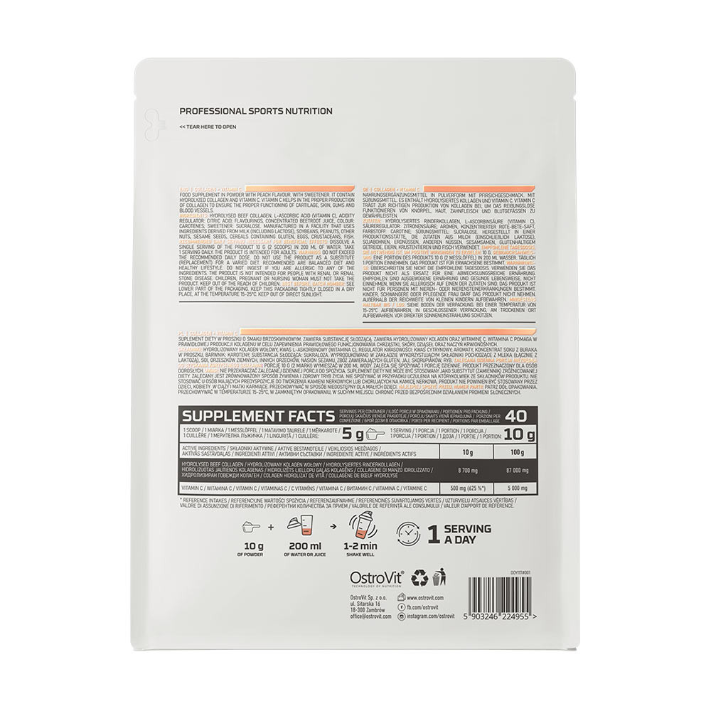 A kollagén a szervezet egyik fő építőfehérjéje, természetes polimer és az állati szervezetek sejtközi anyagának fontos összetevője. Ez egy szerkezeti fehérje, amely az emberi szervezetben található összes fehérje mintegy 30%-át teszi ki. Megtalálható többek között a kötőszövetben, az erekben, valamint az izmokban, a bőrben és a hajban. Mivel a szervezetben a természetes öregedési folyamatok következtében a kollagén szintje a korral csökken, érdemes a vegyületet kívülről is biztosítani a szervezet számára - A kollagén többek között állati csontokban vagy inakban fordul elő, és étrend-kiegészítők formájában is elérhető. Az OstroVit készítményben használt marhahús kollagént nagyon jó biológiai hozzáférhetőség jellemzi, ami miatt könnyen felszívódik az emberi emésztőrendszerben. Ezenkívül a marhahús-kollagénnek nincs jellegzetes szaga, ami néha előfordulhat az étrend-kiegészítőkben, amelyek alapja a hal-kollagén.