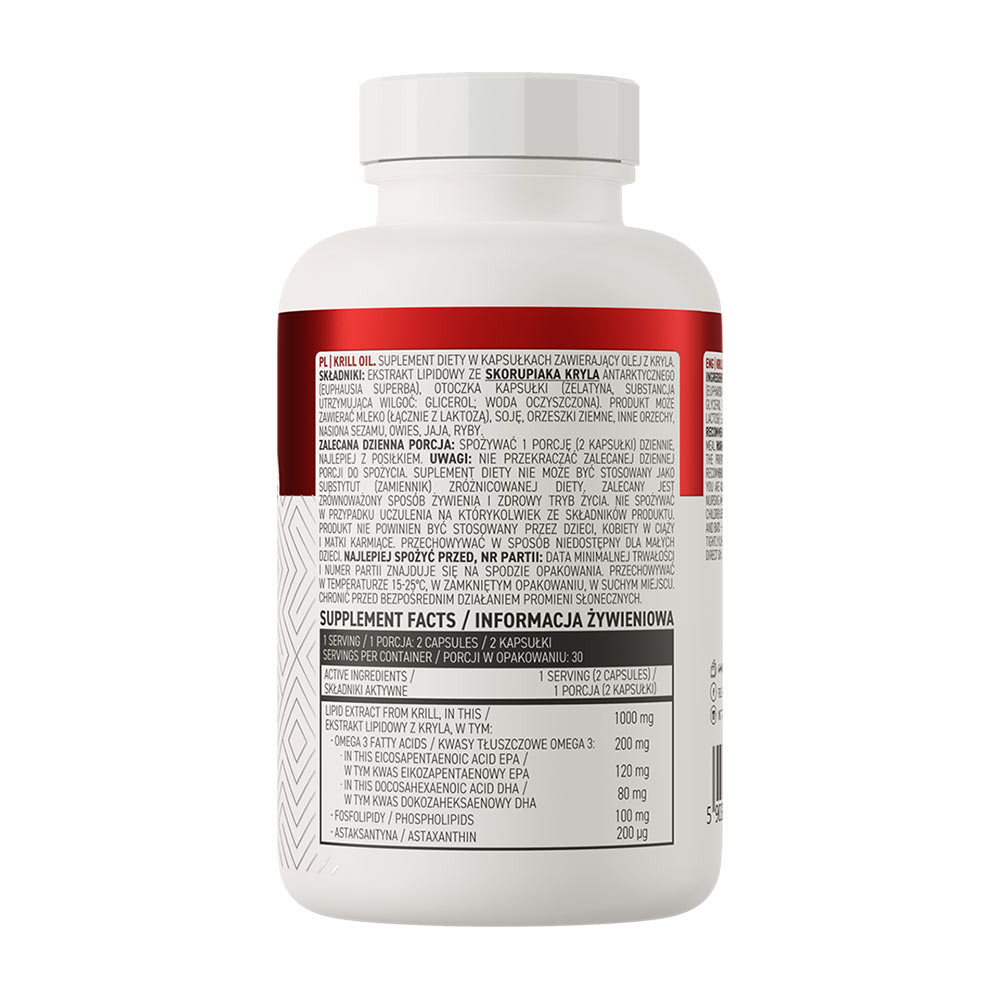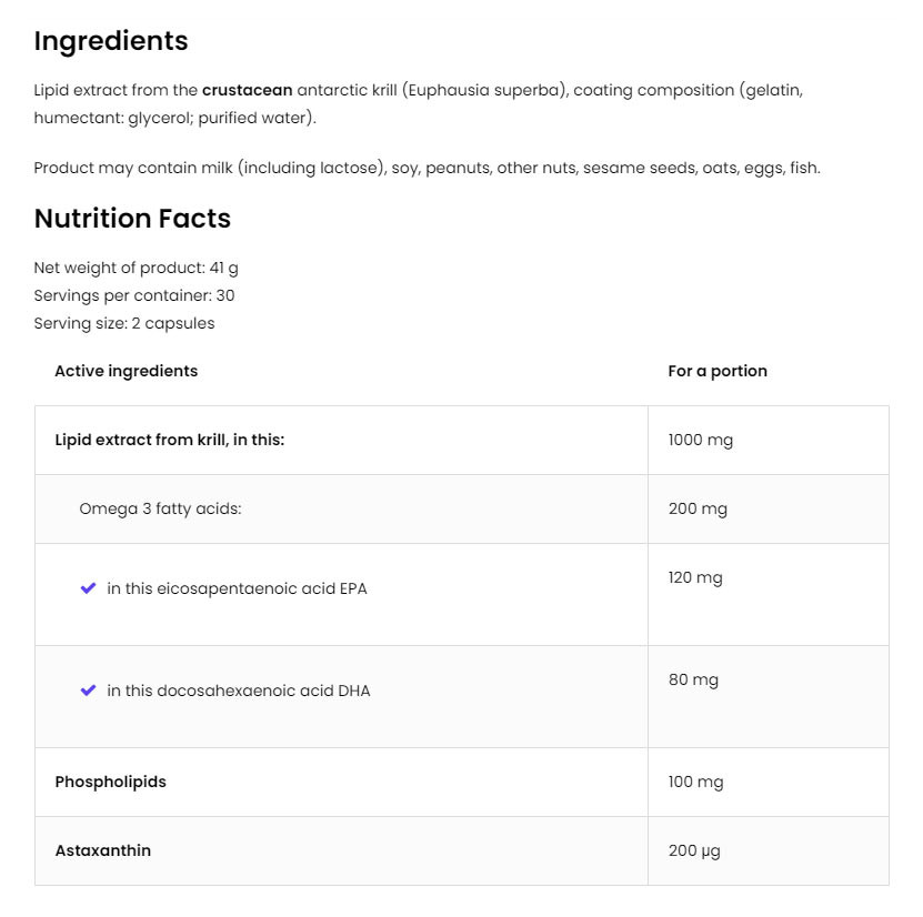 • Az értékes összetevők forrása - az étrend-kiegészítő egy adagja 1000 mg antarktiszi krill lipidkivonatot biztosít a szervezet számára, amely 120 mg eikozapentaénsavat (EPA), 80 mg dokozahexaénsavat (DHA), valamint 100 mg foszfolipidet és 200 μg asztaxantint tartalmaz.