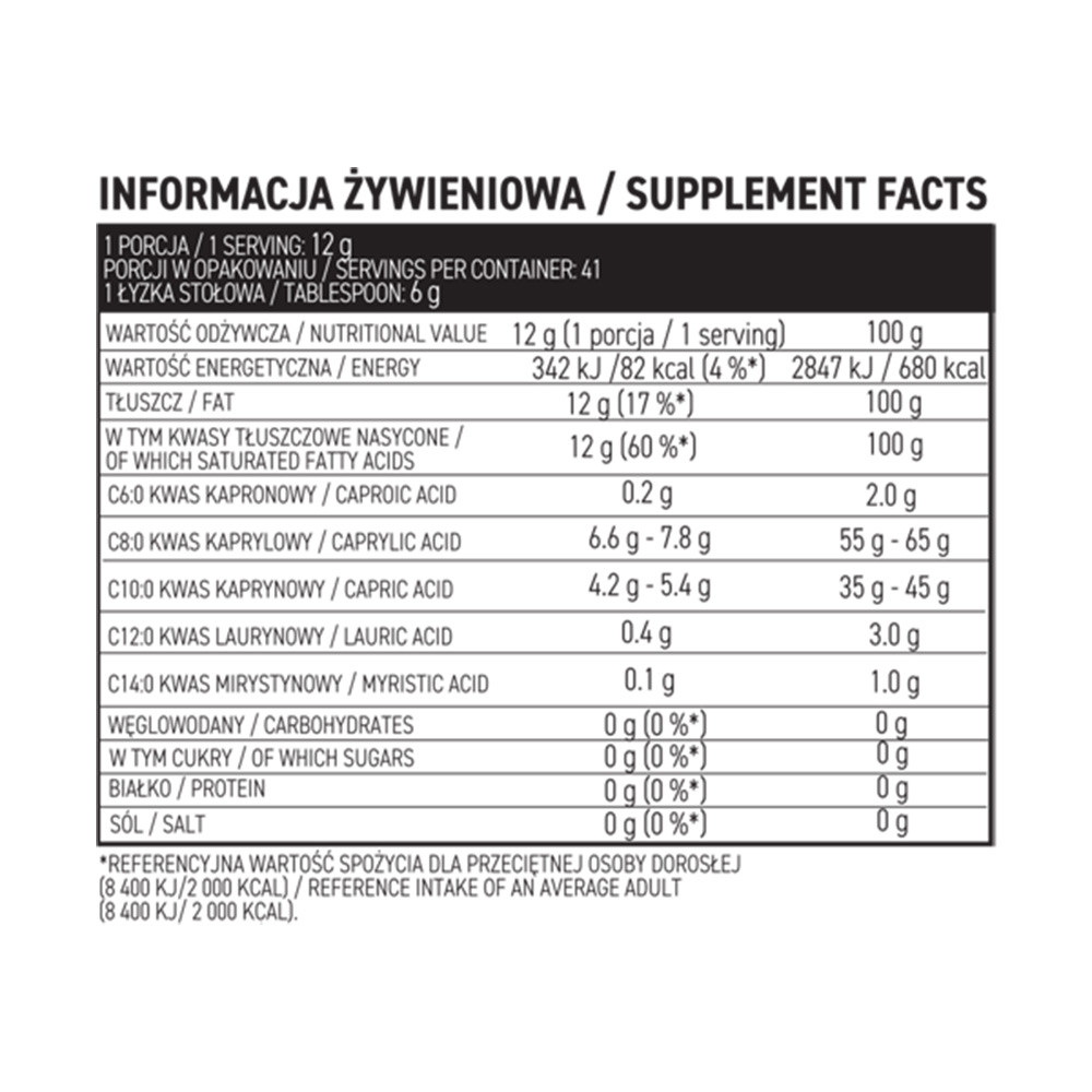 • Közepes láncú zsírsavak MCT (közepes láncú trigliceridek) forrása - Az étrend-kiegészítő egy adagja 12 g zsírt tartalmaz, beleértve a kaprikus vagy kaprilsavat is.