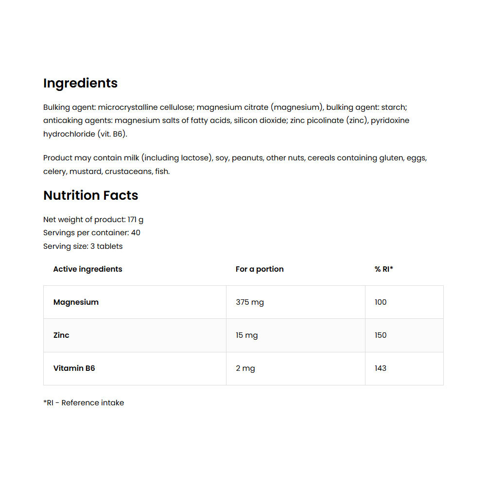 Három összetevőből álló készletet tartalmaz - magnéziumot, cinket és B6-vitamint magas biológiailag hozzáférhető formában.