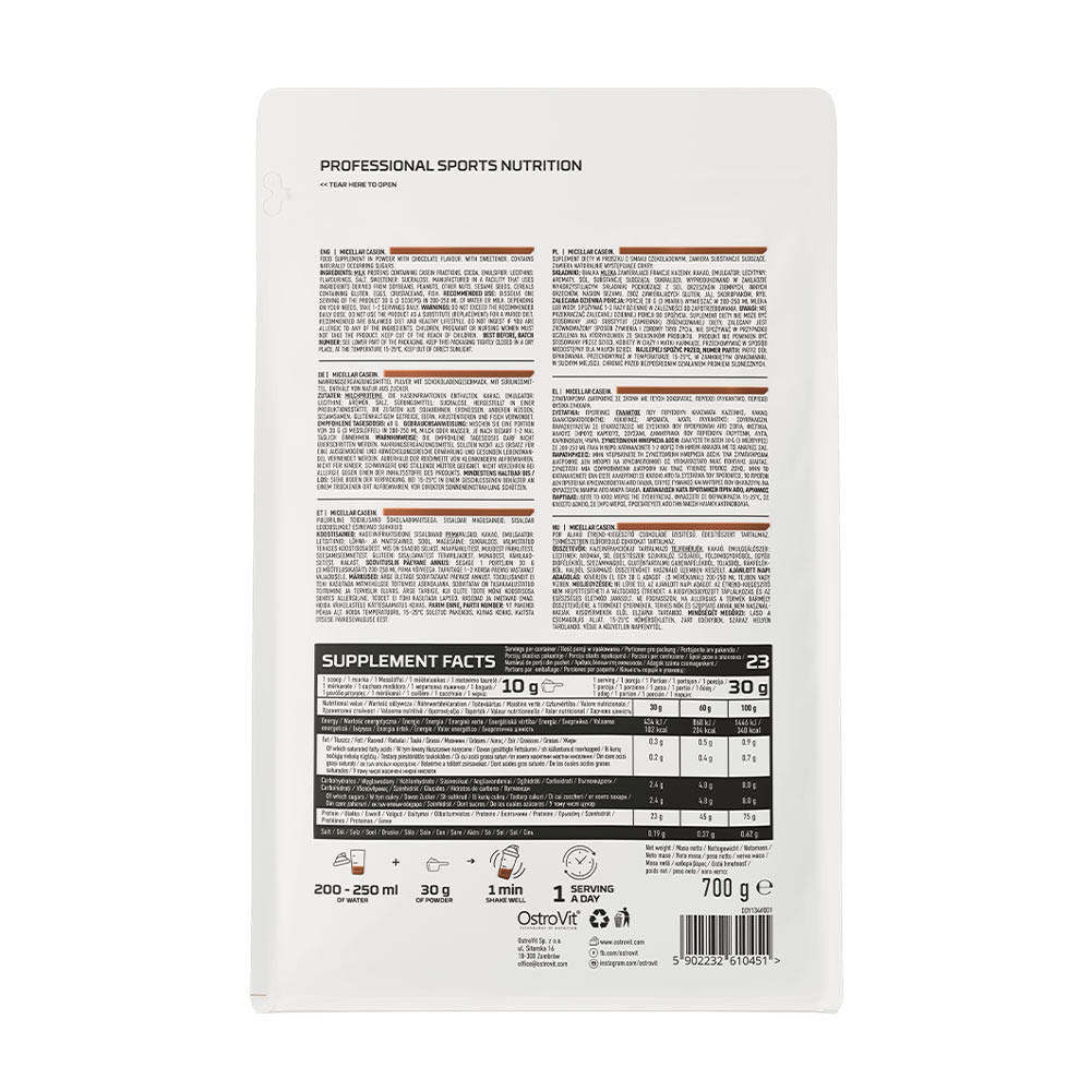 Az OstroVit micelláris kazein egy étrend-kiegészítő, amely a legmagasabb minőségű micelláris kazein forrása. Ez a kazein leghatékonyabb formája. Nagyon lassú felszívódási idő jellemzi, aminek köszönhetően több órás építőanyag-ellátást biztosít az izomszövetnek. A kazein a gyomorban alvadási folyamaton megy keresztül, ami lelassítja az emésztését és meghosszabbítja a felszívódási időt.