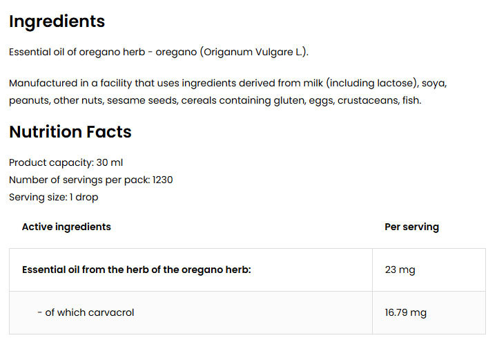 • Értékes összetevő forrása - a termék egy adagja 23 mg oregánó illóolajat biztosít a szervezet számára.