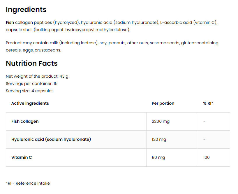 Tengeri hal kollagén - az emberi szervezetben található egyik legfontosabb fehérje. Szinte minden emberi szövetben jelen van. Ez az alapvető építőelem többek között a bőr, az inak, a csontok, az ízületek, a szem szaruhártyája. Felelős az ízületi folyadék termeléséért, a porcok rugalmasságáért és keménységéért, a bőr hidratálásáért és a bőr megfelelő megújulásáért. Befolyásolja a kötőszövet kohézióját, szilárdságát és rugalmasságát. Egyedülálló vízmegkötő képességgel is rendelkezik, melynek köszönhetően a bőr megőrzi megfelelő rugalmasságát és feszességét. 26 éves kor után a kollagénrostok mennyisége természetes módon csökken, és a szervezet elveszíti a képességét az újjáépítésükre. A fokozott fizikai aktivitás ráadásul fokozza a kollagén pusztulási folyamatát, ezért nagyon fontos a pótlása intenzív gyakorlatok és edzések során. A kollagénhiány okozza a mozgászavarokat, az ízületi merevséget és a hátfájást, megjelennek a ráncok, a cellulitisz, csökken a bőr hidratáltsága és feszessége.