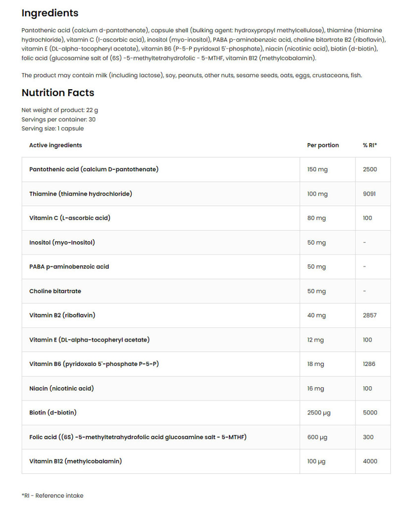 Biotin (B7-vitamin) - hozzájárul a megfelelő energiaanyagcsere fenntartásához, segíti az idegrendszer megfelelő működését. Ezenkívül hozzájárul a makrotápanyagok megfelelő anyagcseréjének fenntartásához. A biotin hozzájárul a bőr és a haj egészségének megőrzéséhez, valamint a nyálkahártyák megfelelő állapotának fenntartásához.