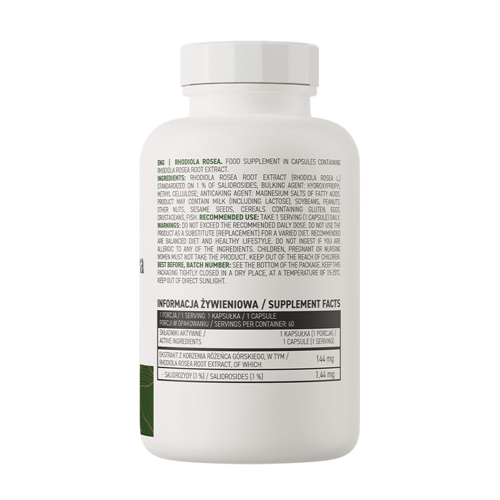 Rhodiola rosea gyökérkivonat - Rhodiola rosea L. - a crassulaceae családba tartozó növény gyökerének kivonata, más néven sarki gyökér. A hagyományos gyógyászatban már évszázadok óta használt anyag, amelyet adaptogénnek tartanak. A Rhodiola rosea gyökerét értékes anyagokban való gazdagsága jellemzi, és a termékben található egyik legfontosabb vegyület a szalidrozidok, amelyek tartalmát az OstroVit készítményben használt növényi kivonat standardizálja, ami pozitív hatással van az étrend-kiegészítő minőségére.