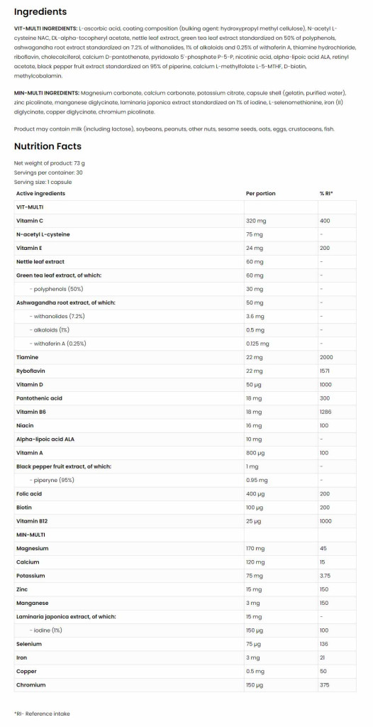 • A C-vitamin jótékony hatással van az idegrendszerre és az immunrendszerre. A magas biológiai hozzáférhetőségű szerves formákból származó ásványi anyagok, mint például: vas, mangán és réz bisglicinát (kelát), króm és cink pikolinát, szelén (L-szelenometionin), magnézium, kalcium és kálium citrát formájában.