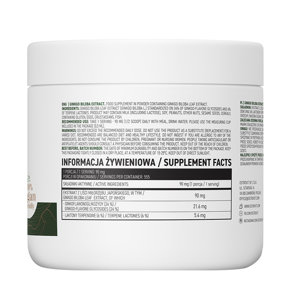 Az OstroVit Ginkgo Biloba Extract egy étrend-kiegészítő, amely 24% ginkoflavonoglikozidokra és 6% terpén-laktonokra standardizált ginkgo biloba levélkivonatot tartalmaz. Ez egy kiváló minőségű készítmény, amely kényelmes por formában kapható, és olyan tudatos fogyasztók számára készült, akik értékes anyagokkal szeretnék kiegészíteni étrendjüket.