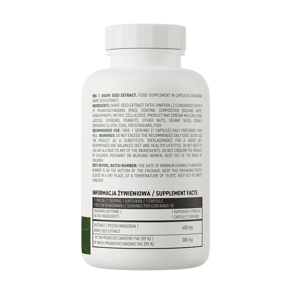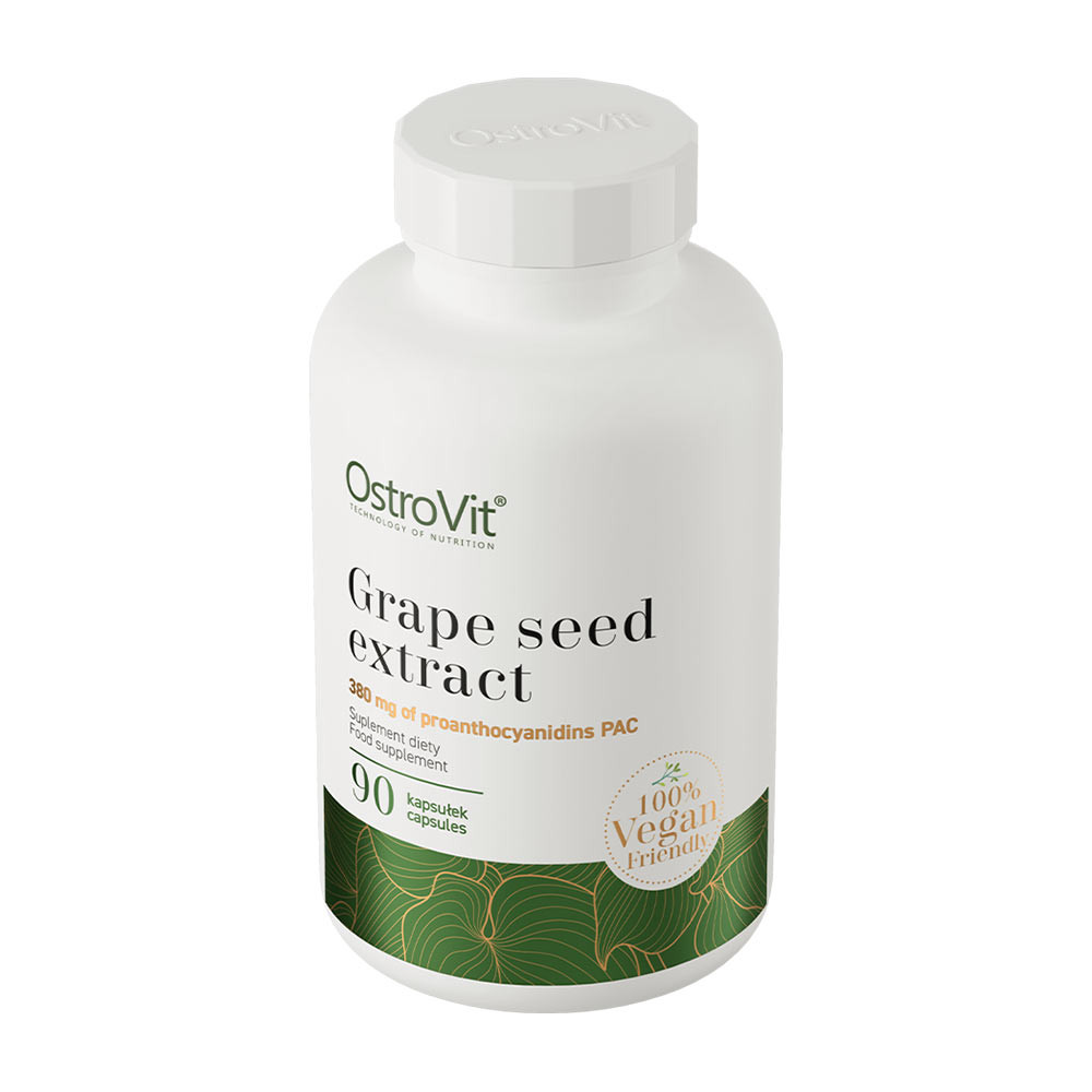 Az OstroVit Grape Seed Extract VEGE egy kiváló minőségű étrend-kiegészítő, amely 95% proantocianidinre standardizált szőlőmag-kivonatot tartalmaz. Ez egy vegán készítmény, amely könnyen lenyelhető kapszula formájában kapható, és olyan emberek számára készült, akik szeretnék kiegészíteni a napi étrendjüket értékes vegyületekkel.