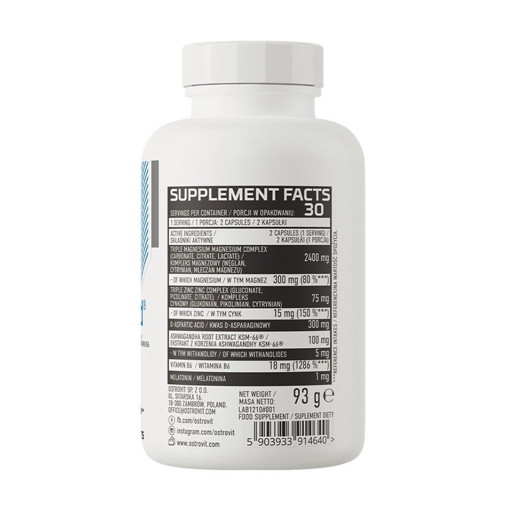 • Értékes hatóanyagok készlete - az étrend-kiegészítő egy adagja 2400 mg magnéziumkomplexet, valamint 75 mg cinkkomplexet biztosít a szervezet számára. Ezen kívül a készítmény 300 mg D-aszparaginsavat, 100 mg 5% withanolidra standardizált ashwagandha gyökérkivonatot, 18 mg B6-vitamint és 1 mg melatonint tartalmaz.