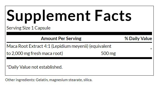 • Erőteljes 4:1 arányú kivonat, amely 2000 mg friss maca gyökérnek felel meg.