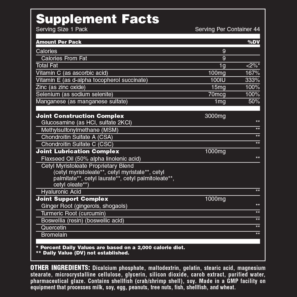 Az Animal Flex megerősíti és egészségesen tartja az ízületeket és inakat, pajzsként védve a mindennapi terhelés károsító hatása ellen. Speciális hatóanyag-mátrixa fokozza az ízületek mozgékonyságát és rugalmasságát, megadja mindazt amire strukturális-integritáshoz szükséged van. Az Animal Flex, mint mindegyik Animal-kiegészítő komplett és minden apró részletet felölel. Minden csomag tartalmaz: (1) egy speciális ízületvédő- és regeneráló komplexet (2) egy az ízületek megfelelő kenését biztosító keveréket (3) a sérült ízületek helyreállítását és a fájdalom csökkentését szolgáló mátrixot és (4) egy az ízületek egészségéhez szükséges vitamin és ásványi-anyag keveréket.