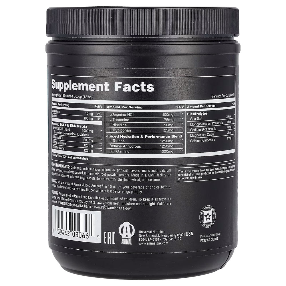 Az Animal Juiced Aminos instant aminosav formula, mely az elágazó láncú aminosav (BCAA) mellett az egyéb kritikus esszenciális aminosavakat is tartalmazza, kiegészítve a teljesítményt és regenerációt fokozó további összetevőkkel.
