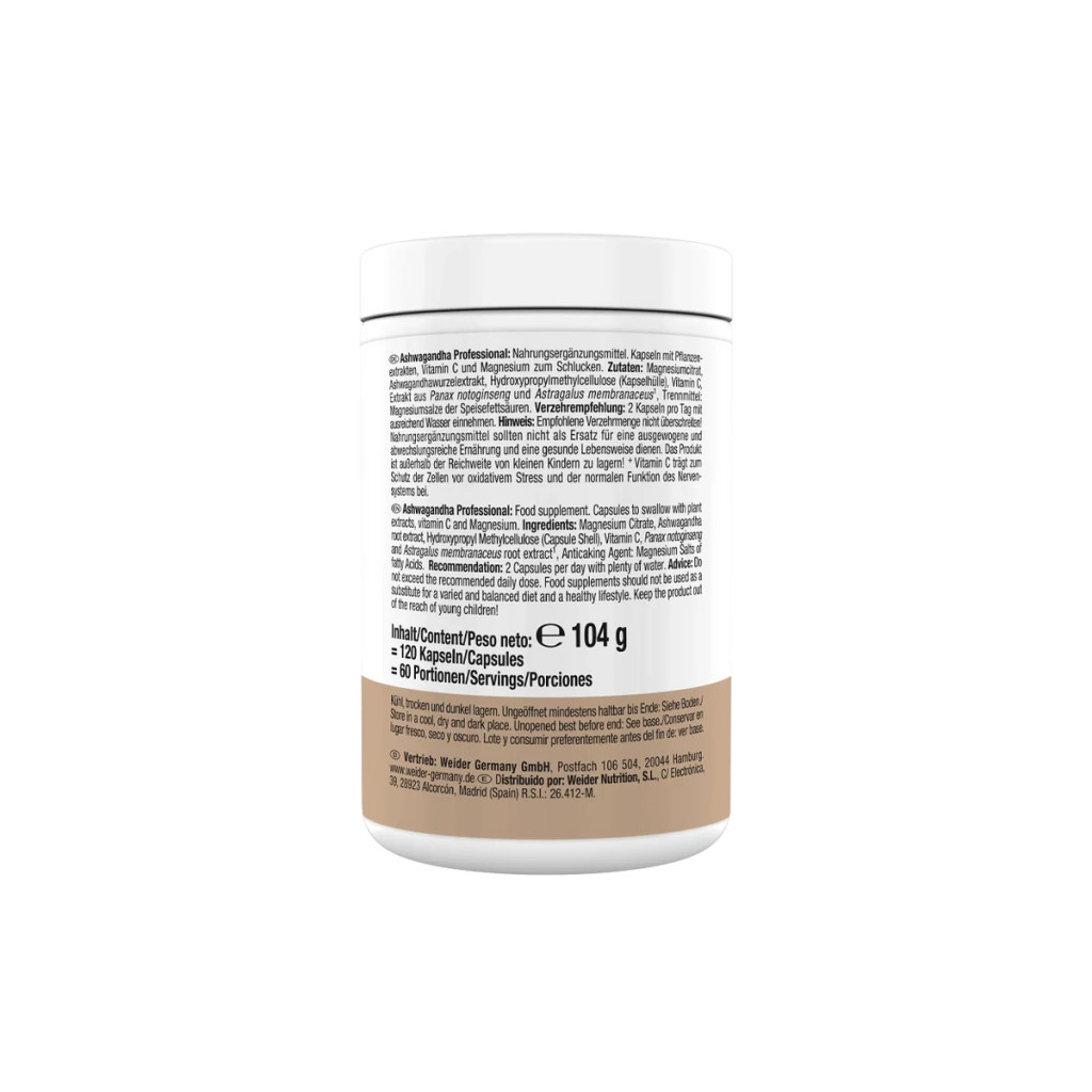 Weider Ashwagandha Professional – standardizált KSM-66® kivonattal a fizikai és mentális egyensúlyért. A Weider Ashwagandha Pro klinikailag vizsgált, magas hatóanyag-tartalmú KSM-66® ashwagandha kivonatot tartalmaz, amely hozzájárulhat a stresszel szembeni ellenálló-képesség növeléséhez, a mentális fókusz fenntartásához, valamint a hormonális egyensúly támogatásához.