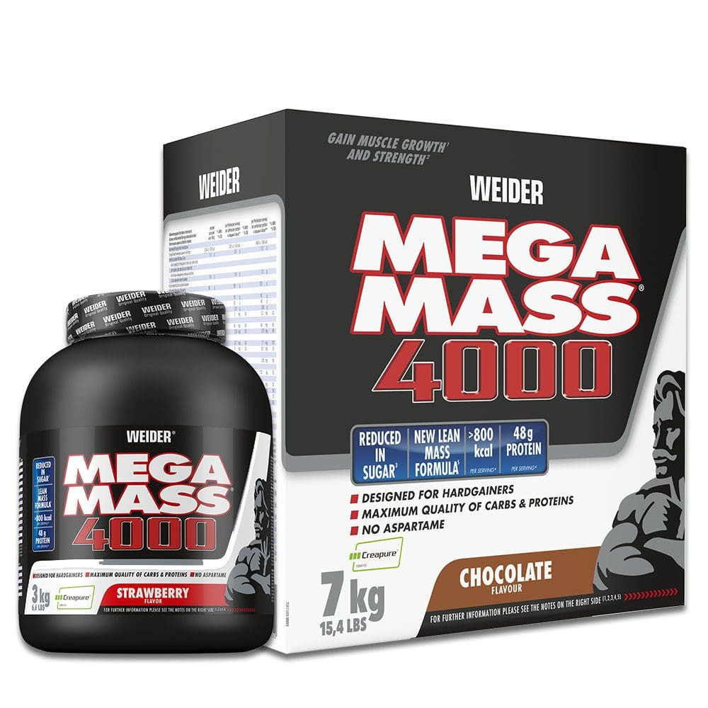 A Weider Mega Mass® 4000 tömegnövelő remek választás mindazok számára, akiknek az izomtömeg-növelése a céljuk, vagy a magasabb kalóriabevitel az intenzív edzésekhez. Ez az étrend-kiegészítő kiemelkedő minőségű fehérjét és szénhidrátot biztosít a sportolók minden szükségletének fedezésére. A Mega Mass® 4000 táplálékkiegészítőt úgy alkották meg, hogy cukortartalmát drasztikusan csökkentették, az alapanyagául szolgáló cukormentes szénhidrát keveréket kukorica maltodextrinből, búzakeményítőből, teljes kiőrlésű zablisztből és burgonyakeményítőből állítják elő.