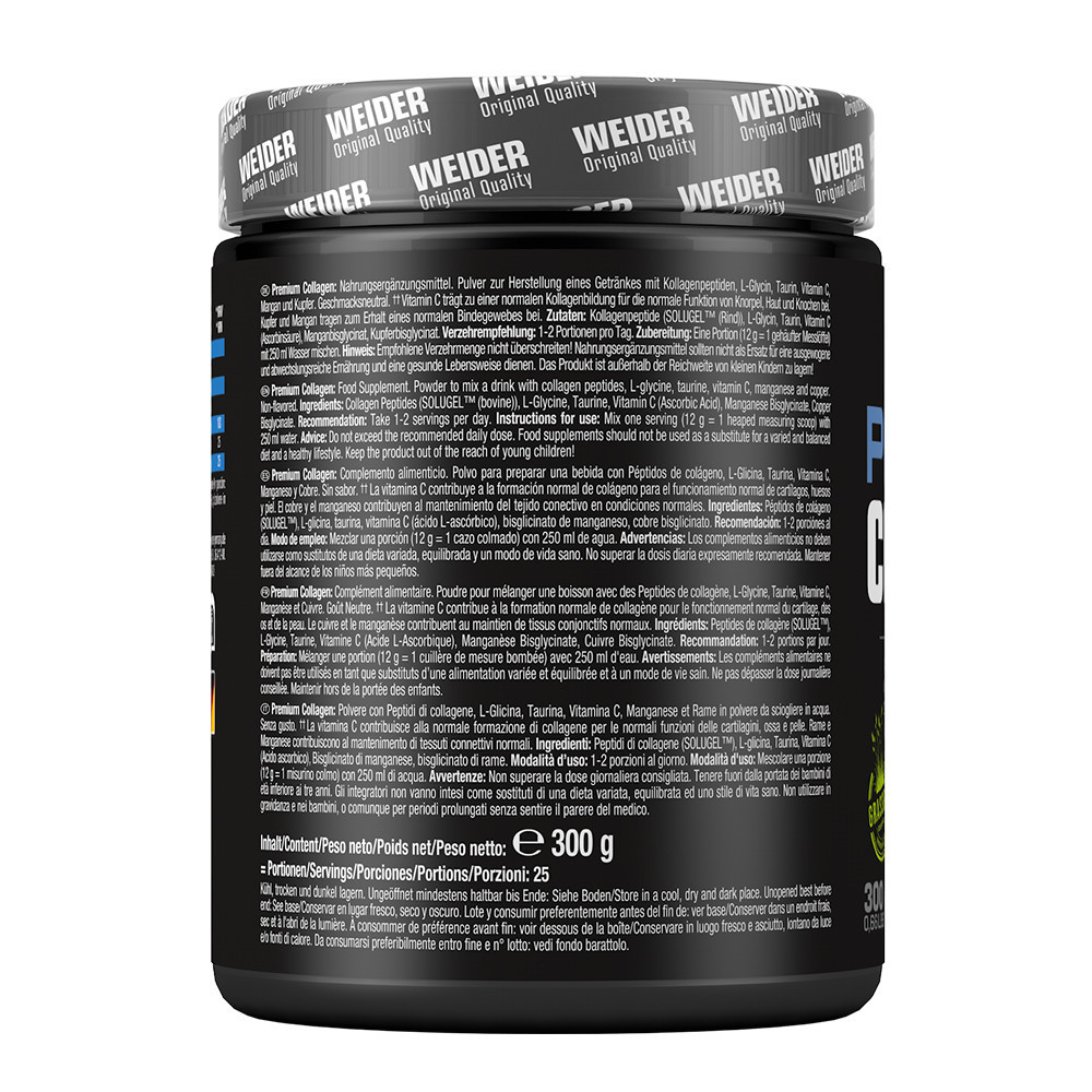 A Weider Premium Collagen kollagén italpor magas minőségű, ízesítetlen hidrolizált (SOLUGEL™) marha kollagént tartalmaz, ami hozzájárul az ízületek védelméhez. Ezek mellett a Weider kollagén italpor tartalmaz még mangánt, rezet, taurint és C-vitamint is, ami elengedhetetlen a kollagén megfelelő beépüléséhez.