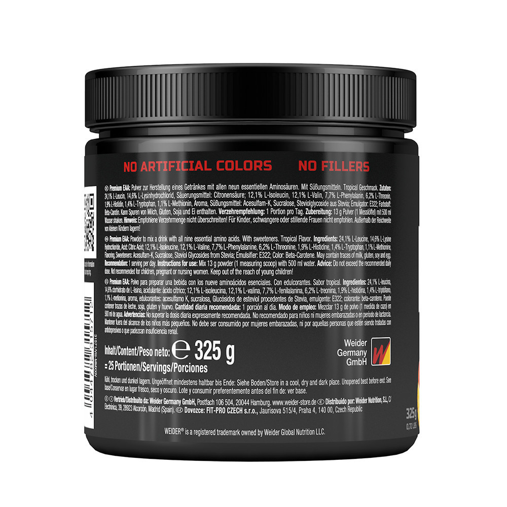 A Weider Premium EAA aminosav italpor egy esszenciális aminosav tartalmú italpor, 4 féle ízben kapható. Ezek az aminosavak fontos szerepet töltenek be a szervezet működésében, hiszen a fehérjék építőkövei, így például hozzájárulnak az izomszövetek építéséhez, valamint meggátolják az anabolizmust. Az esszenciális aminosavakat a szervezet nem tudja előállítani, így ezeket külső forrásból kell pótolni, például táplálékkiegészítők segítségével. A Weider esszenciális aminosav tartalmú italpor cukormentes, így bárki számára kiváló választás.