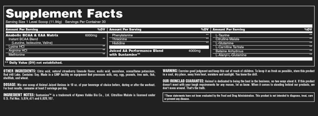 Az Animal Juiced Aminos instant aminosav formula, mely az elágazó láncú aminosav (BCAA) mellett az egyéb kritikus esszenciális aminosavakat is tartalmazza, kiegészítve a teljesítményt és regenerációt fokozó további összetevőkkel.