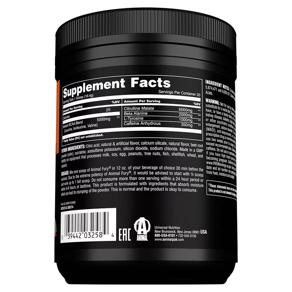 Az Universal Animal Fury a leghatékonyabb és legtöbbet bizonyított teljesítmény fokozó hatóanyagok keveréke, mint a Citrullin-malát, a béta-alanin, az L-tirozin és a koffein. Mindezt 5 gramm BCAA teszi teljessé, ami így egy komplett és garantáltan hatékony edzés előtti mátrixot ad!