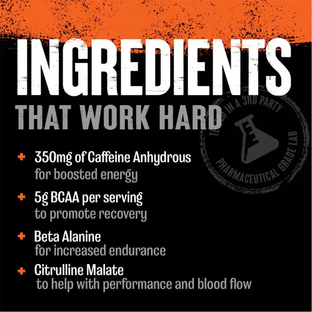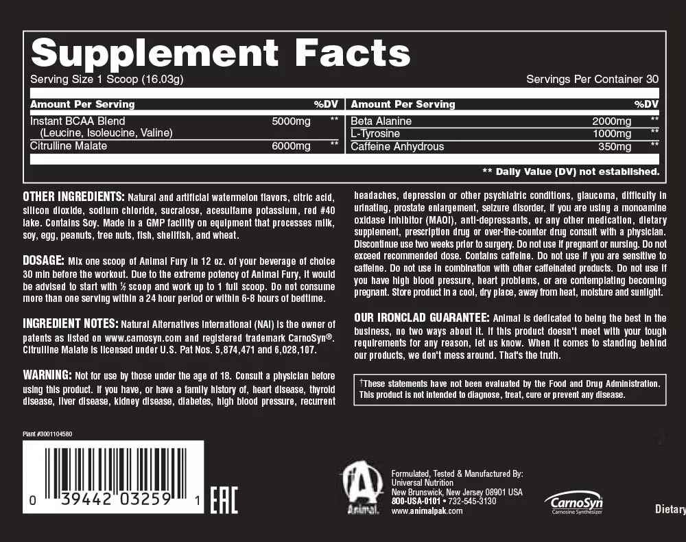 Az Universal Animal Fury a leghatékonyabb és legtöbbet bizonyított teljesítmény fokozó hatóanyagok keveréke, mint a Citrullin-malát, a béta-alanin, az L-tirozin és a koffein. Mindezt 5 gramm BCAA teszi teljessé, ami így egy komplett és garantáltan hatékony edzés előtti mátrixot ad!
