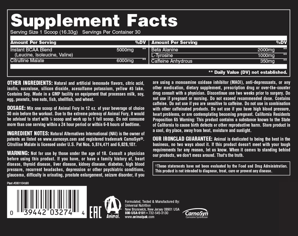 Az Universal Animal Fury a leghatékonyabb és legtöbbet bizonyított teljesítmény fokozó hatóanyagok keveréke, mint a Citrullin-malát, a béta-alanin, az L-tirozin és a koffein. Mindezt 5 gramm BCAA teszi teljessé, ami így egy komplett és garantáltan hatékony edzés előtti mátrixot ad!