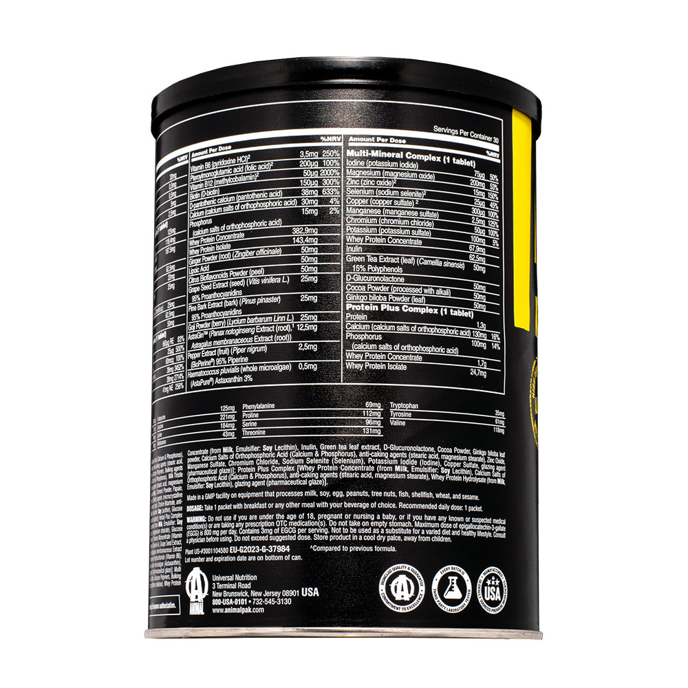 Az Animal Pak egy teljes értékű táplálék, amely több mint 85 jól felszívódó tápanyaggal van megtöltve, amely a vitaminok, ásványi anyagok, aminosavak, antioxidánsok, emésztőenzimek, karnitin, gyógynövények és egyéb anyagok hatékony kombinációjával fokozza az edzéseket és növeli az energiát a mindennapi életben. Több mint egy multivitamin, az Animal Pak kitölti a tápanyaghiányt, biztosítva, hogy felkészüljön az izomnövekedésre és az optimális teljesítményre, miközben fitneszcéljait hajszolja.