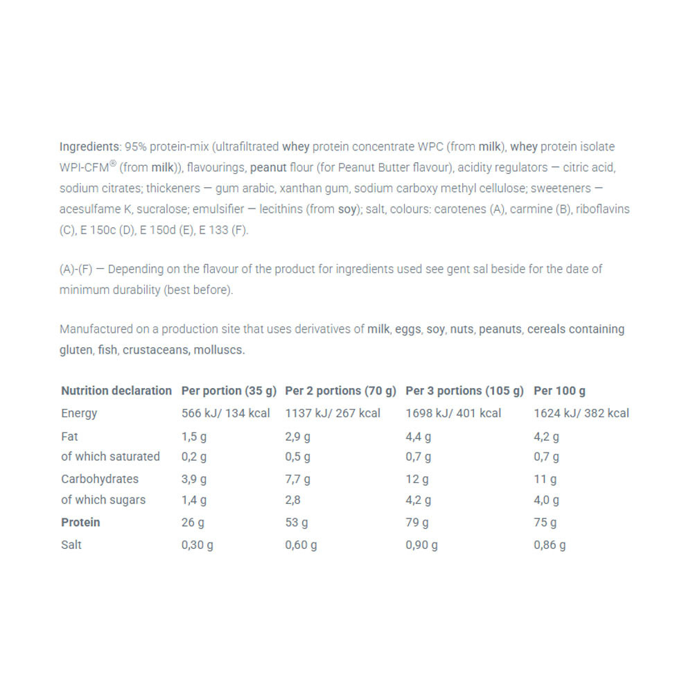 Étrend-kiegészítő. Magas fehérjetartalmú por. Édesítőszerekkel. Kiváló minőségű, ultraszűrt tejsavófehérje-koncentrátum és tejsavófehérje-izolátum keveréke. A termék fizikailag aktív emberek és sportolók számára készült, akik az izomtömeg növelésére törekszenek.
