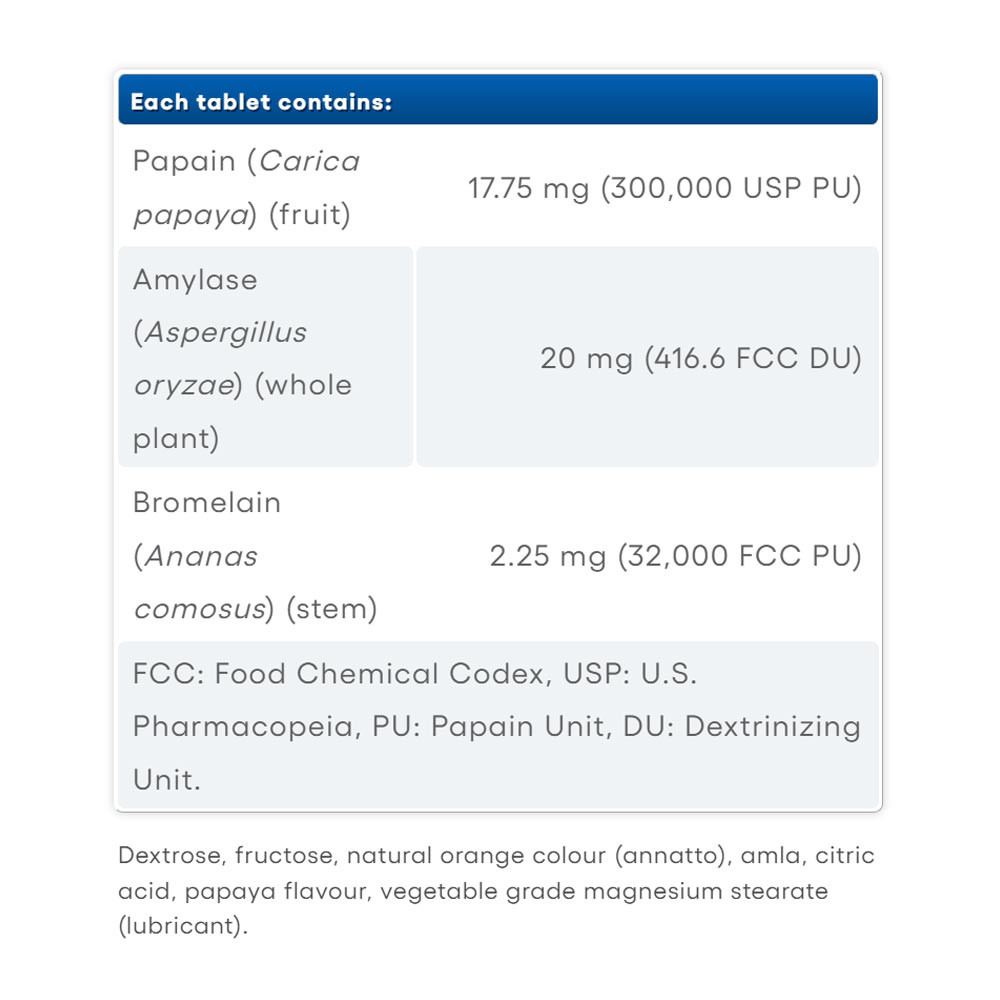 A Natural Factors rágható papaya enzimek amilázzal és bromelainnal természetes ízesítésűek, és segítik a szervezetet a fehérjék, zsírok és szénhidrátok lebontásában, miközben javítják a tápanyagok felszívódását. Az enzimek segítenek stimulálni a jó baktériumokat az emésztőrendszerben, méregtelenítik és tisztítják a vastagbelet, valamint javítják az emésztést.